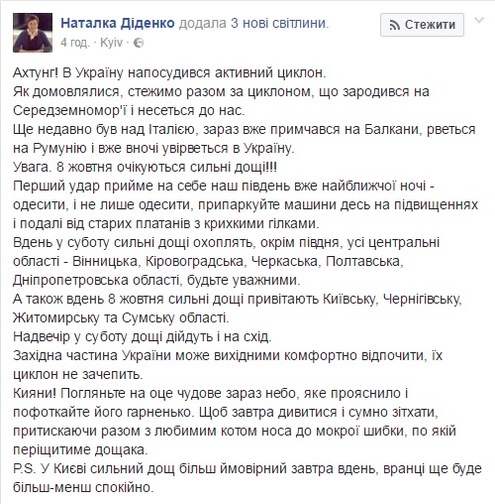 «Перший удар прийме на себе наш південь найближчої ночі — одесити, і не лише одесити, припаркуйте машини на підвищеннях і подалі від старих платанів із крихкими гілками. Вдень у суботу сильні дощі охоплять, окрім півдня, усі центральні області — Вінницьку, Кіровоградську, Черкаську, Полтавську, Дніпропетровську. Будьте уважними. Також удень 8 жовтня сильні дощі привітають Київську, Чернігівську, Житомирську та Сумську області. Надвечір у суботу дощі дійдуть і на схід. Західна частина України може вихідними комфортно відпочити, їх циклон не зачепить. У Києві сильний дощ більш імовірний завтра вдень, вранці ще буде спокійно», — пише синоптик.