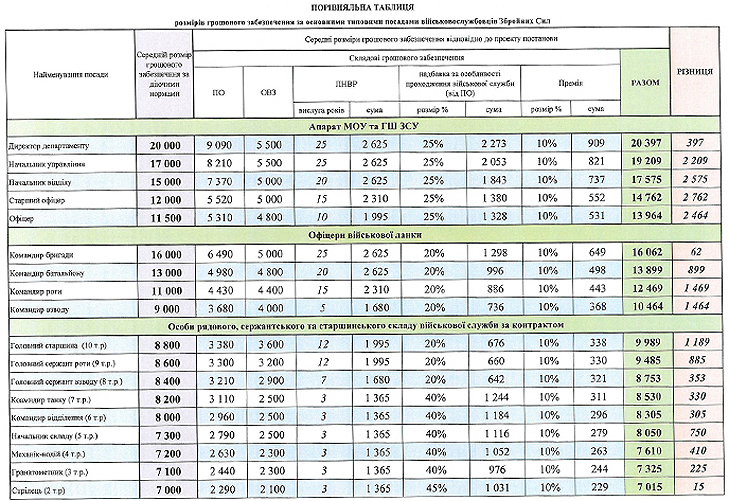 С принятием нового Постановления ситуация в корне изменится. Должностные оклады рядового состава составят 2300-2700 грн., сержантского и старшинского — 2800-3400, офицерского — 3600-6500 грн. на месяц. Также значительно повысятся оклады за воинские звания (2100-5000 грн.) и надбавка за выслугу лет.