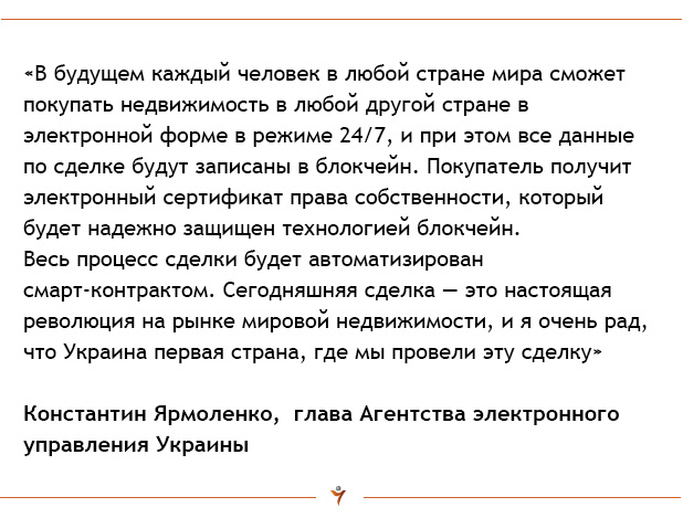 По его словам, квартиру в Киеве приобрел американский покупатель через децентрализованный маркетплейс недвижимости Propy (США), при этом продавец жилья территориально находился в Нью-Йорке. Оплата сделки проводилась в Etherеum.