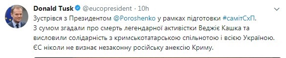 "Встретился с Петром Порошенко в рамках подготовки к саммиту Восточного партнерства. С грустью вспомнили о смерти легендарной активистки Веджие Кашки и выразили солидарность с крымскотатарским сообществом и всей Украины. ЕС никогда не признает незаконную российскую аннексию Крыма", - отметил Туск.