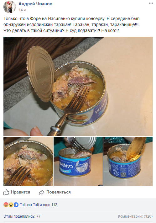 В сети активно обсуждают новость о том, что житель Киева купил банку рыбных консерв, внутри которой обнаружил неприятный сюрприз - огромного таракана.