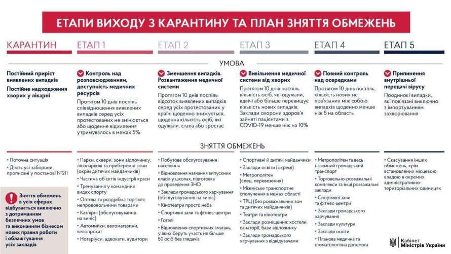 К сожалению, выхода из карантина «экстерном» не получилось, - 4 мая Кабмин продлил суровые санитарные ограничения до 22 мая. 24 апреля Кабинет Министров представил 5-этапный план выхода из карантина, который ввели в Украине с 12 марта.