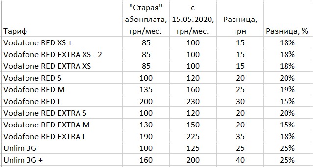 Как следует из таблицы, минимальное повышение абонентской платы составит 15% – с 200 грн до 230 грн ежемесячно в пакете Vodafone RED L. Или со 130 грн/мес. до 150 грн/мес. – в Vodafone RED EXTRA M.
